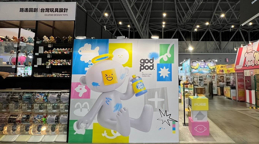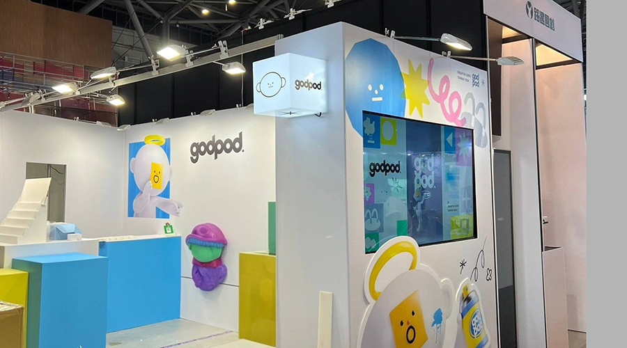 此案為 Muzixiii Studio 目子拾參於 2024 年臺南文博會的展位設計與製作。以白色基底結合亮眼黃、藍方塊,營造活潑且具設計感的氛圍。可愛神明造型融入幾何元素,展現年輕、創意與趣味並存的療癒視覺體驗。
