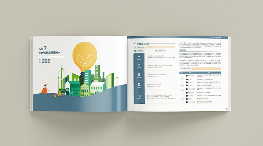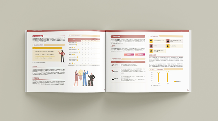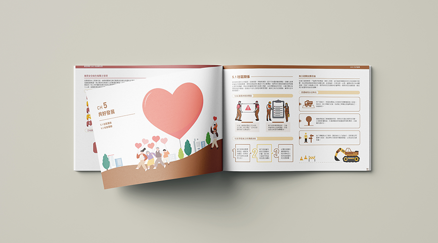 內頁以溫暖的插畫呈現「尊人・敬事・愛物」的人文精神,使永續資訊更加易讀且具溫度,同時凸顯品牌在營建業中的差異化定位。
