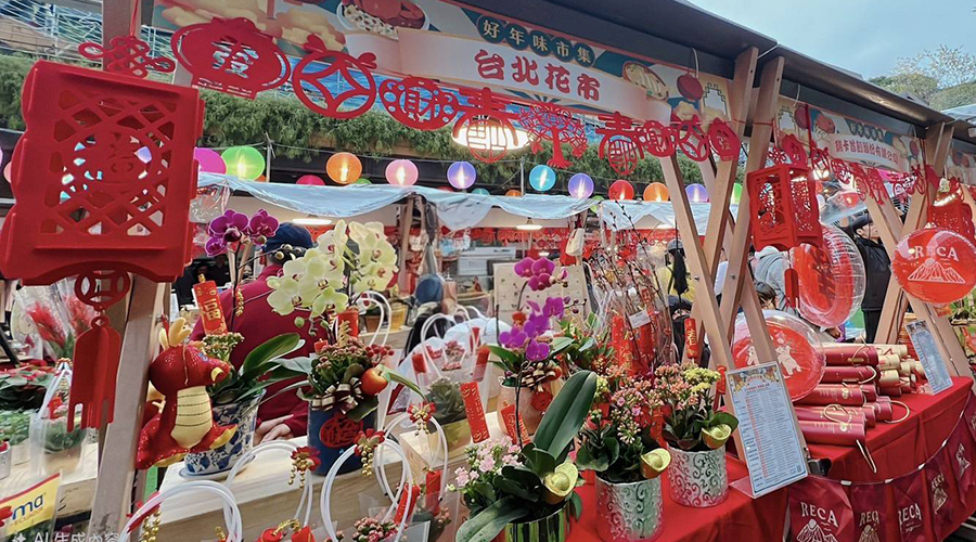 木質攤位搭配喜氣春聯與燈籠,整齊有序又充滿年味,讓民眾在城市廣場中享受溫馨、喜慶的新年體驗。