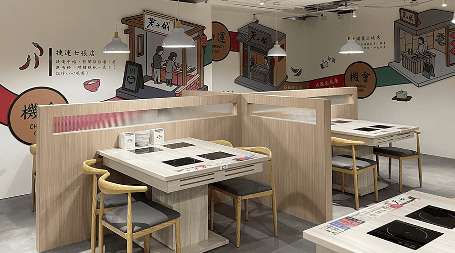 壁貼以大富翁為發想,趣味結合「機會」與「命運」元素介紹各門市;店內配置山水插畫,將樹木與船隻轉化為食材意象;柱面則呈現荖子鍋特色的「荖子製麵機」與「豪華龍蝦鍋」插畫,搭配溫潤色調,營造兼具趣味與品牌故事感的用餐環境。