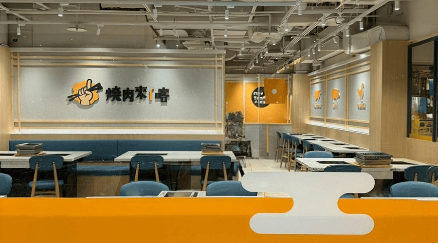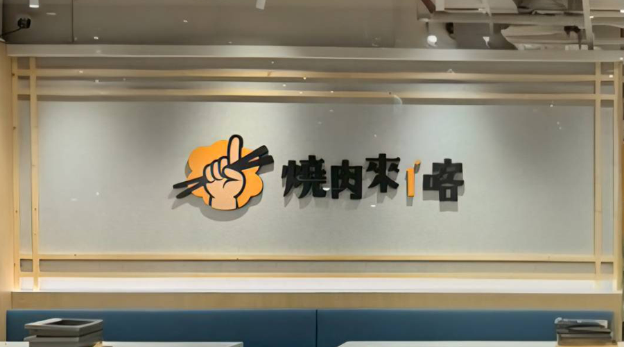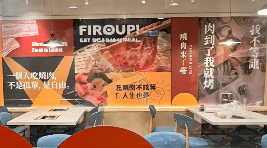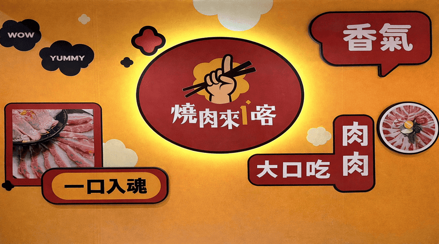 燒肉來一喀於家樂福重慶店登場,艾述設計負責品牌 LOGO 及店內裝飾物設計與施工,包括壁貼、窗貼與霓虹燈等。